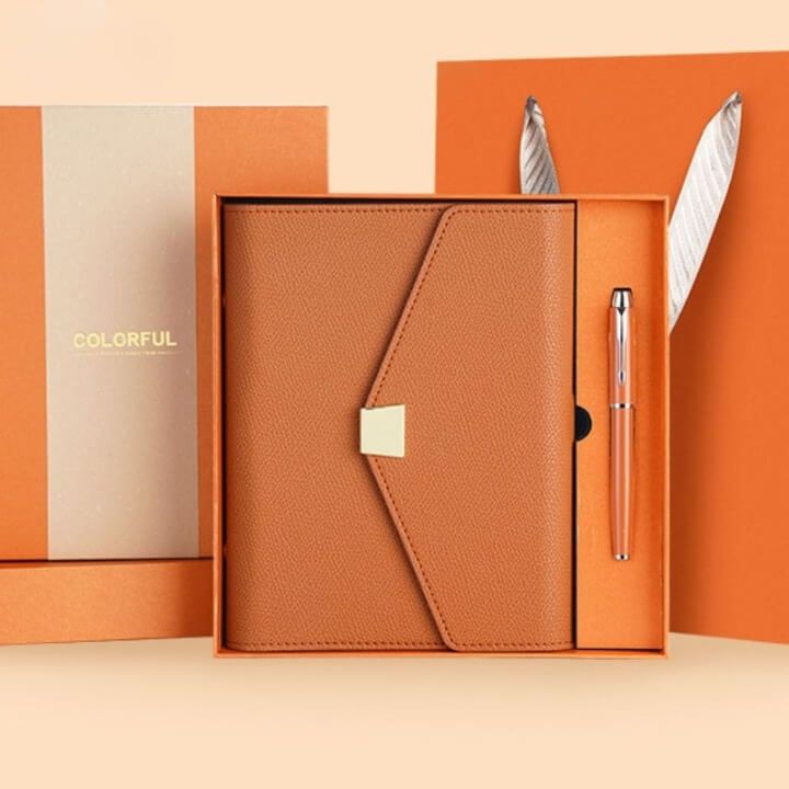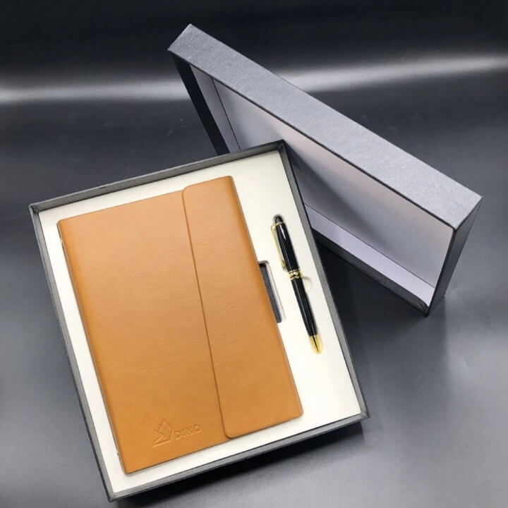 Nếu là quà tặng doanh nghiệp, nên ưu tiên sổ da thật hoặc da PU bền đẹp, thiết kế trang nhã và có thể in logo công ty.